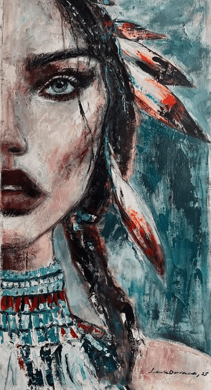 Este retrato revela a Achirana, reina de su tribu, cuyo espíritu se entrelaza con lo místico y lo mágico. Las plumas que adornan su cabeza no solo evocan la conexión con la naturaleza y los ancestros, sino también la autoridad sabia y la libertad que trasciende lo cotidiano. Su mirada profunda y serena refleja el poder de quien guía con justicia y visión, invitando al espectador a un viaje interior donde lo humano se funde con lo espiritual, y lo visible se encuentra con lo intangible de los rituales y sueños sagrados de su pueblo.