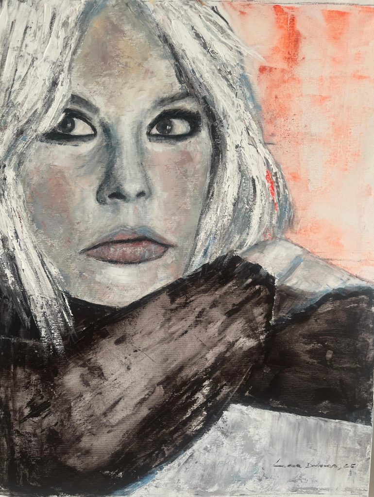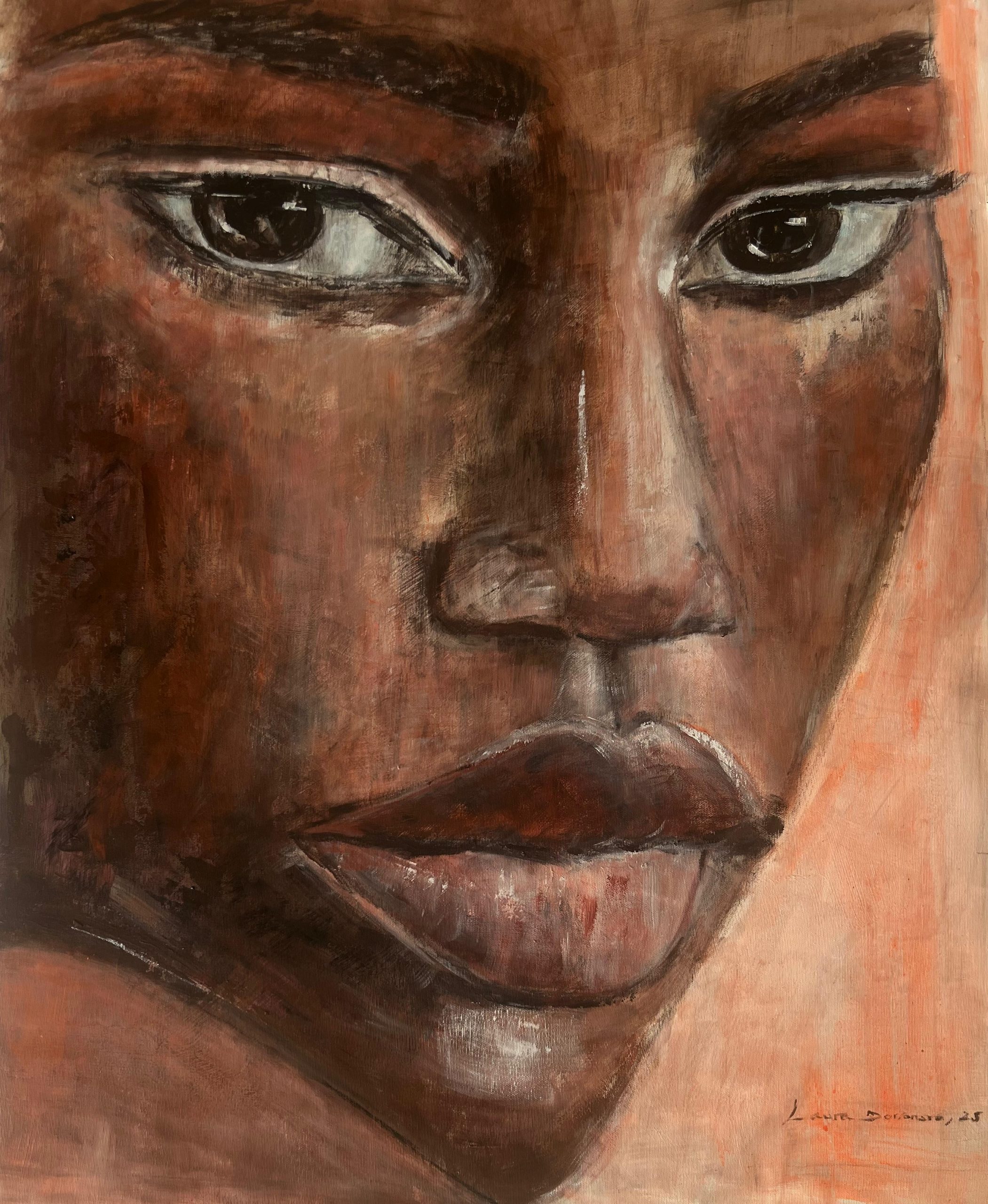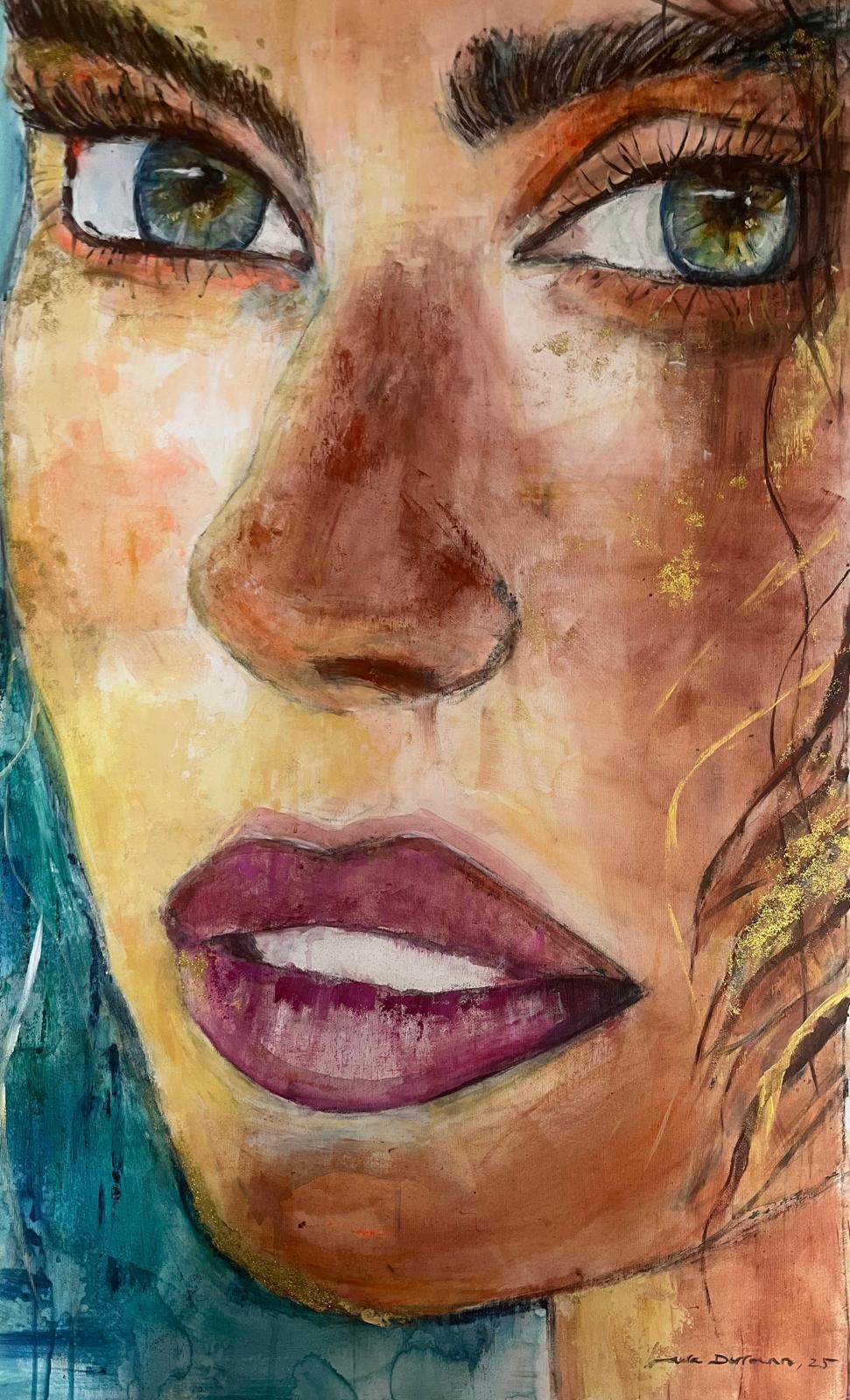 En este cuadro, una mujer de ojos verdes encarna esa fuerza vital: sus ojos son ventanas que iluminan lo oculto, representando tanto misterio como claridad interior. El acrílico, con su intensidad de color y textura, potencia esa energía vibrante, convirtiendo la figura en un símbolo de coraje, intuición y poder femenino.